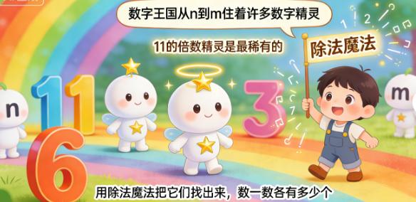 我们要当倍数猎人,用‘除法魔法’把它们找出来,还要数一数各有多少个。”
