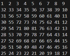 起始值为1,最大值n*n,数字按特定方向进行螺旋递增,9*9的顺时针螺旋方阵输出如下: